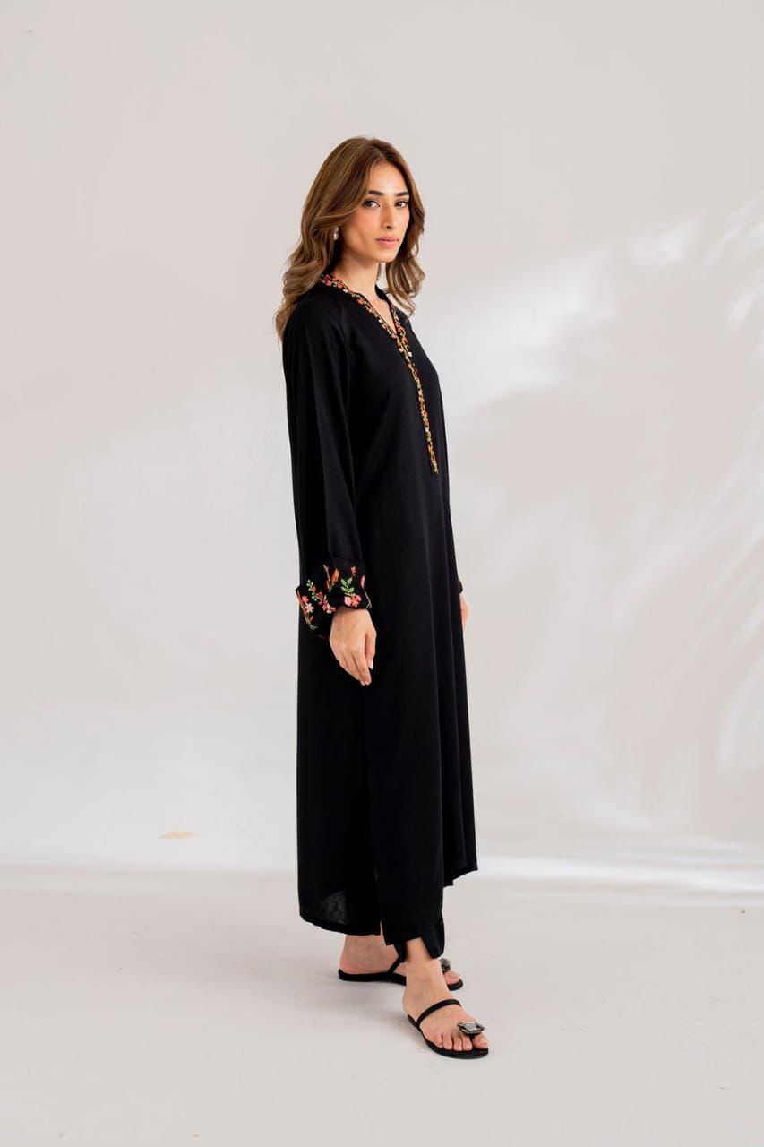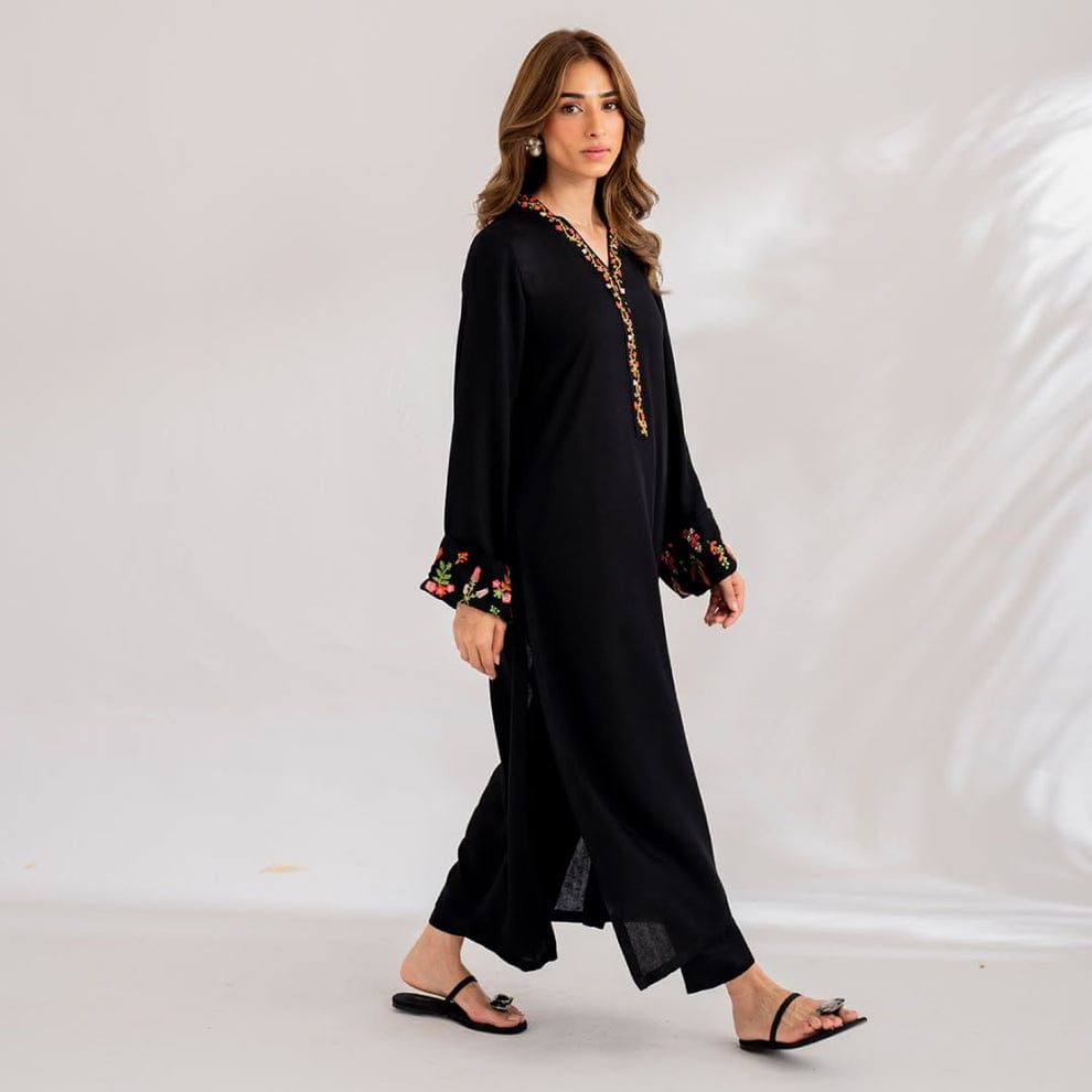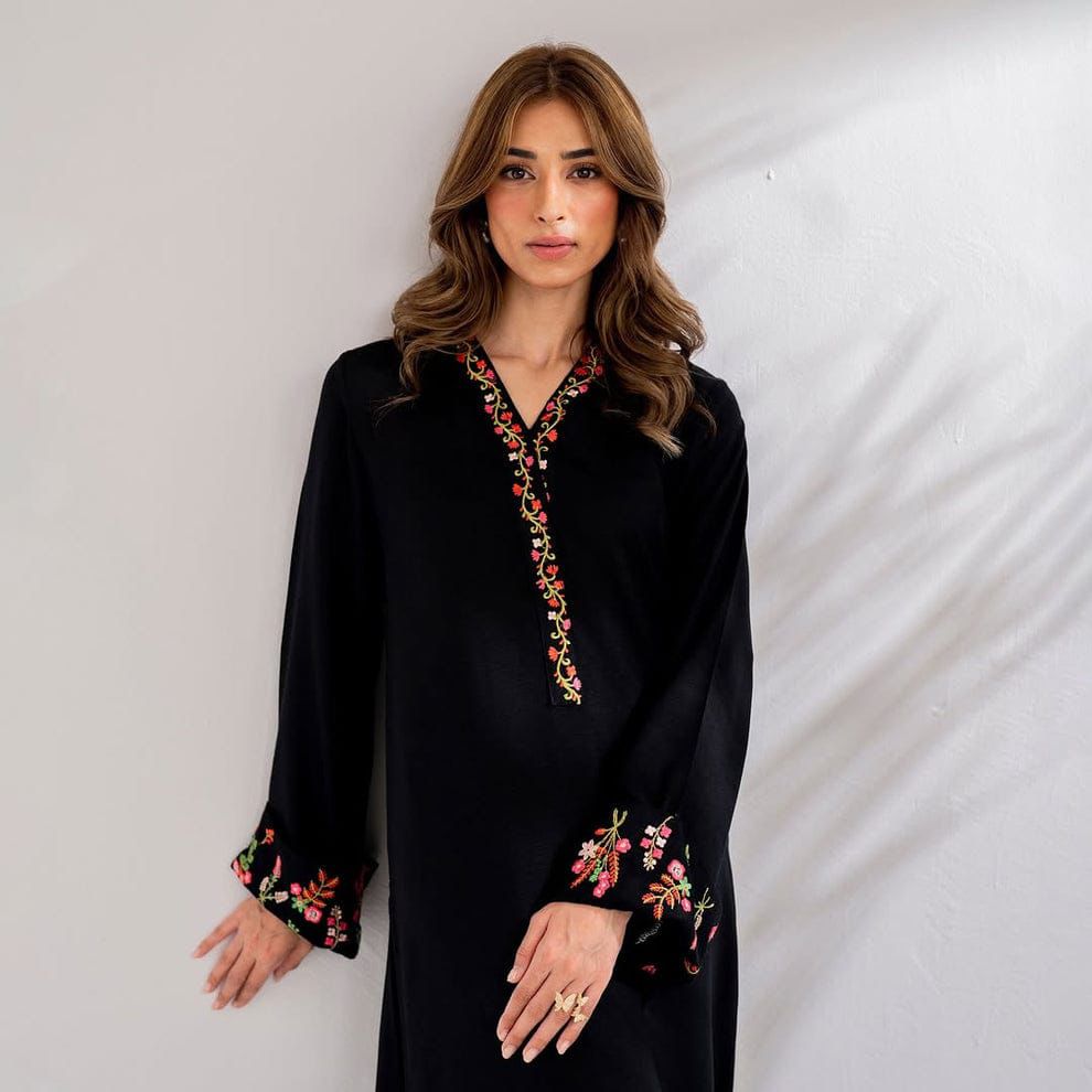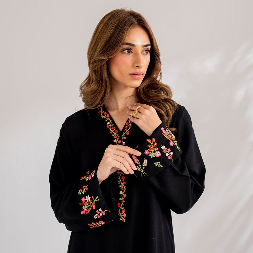 This elegant black embroidered kurta set blends tradition with modern styling. The embroidered neckline and sleeves add a graceful touch, while the lightweight Arabic Lawn fabric ensures comfort during summer. Paired with straight trousers, this outfit transitions seamlessly from casual outings to semi-formal gatherings.