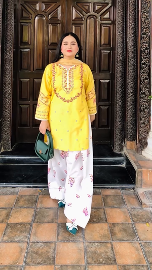 Crafted from breathable cotton fabric, the lemon-colored kurta features delicate embroidered details that add a subtle yet sophisticated touch. The comfortable cotton farshi shalwar complements the top perfectly, while the chiffon dupatta drapes gracefully to complete the look.