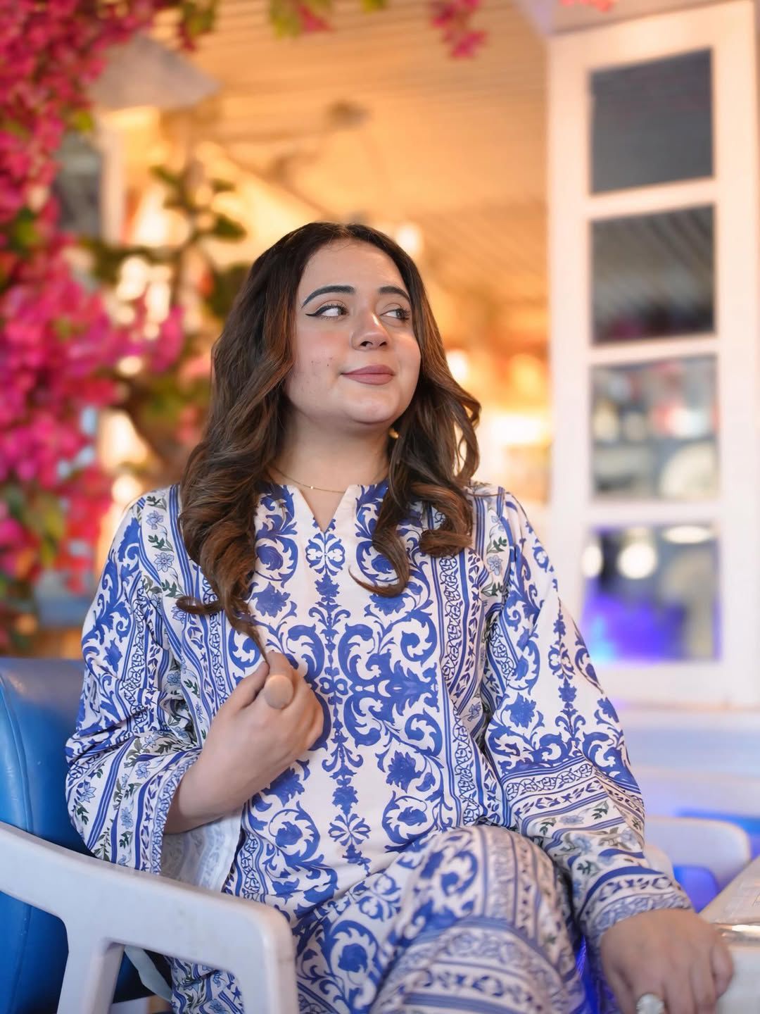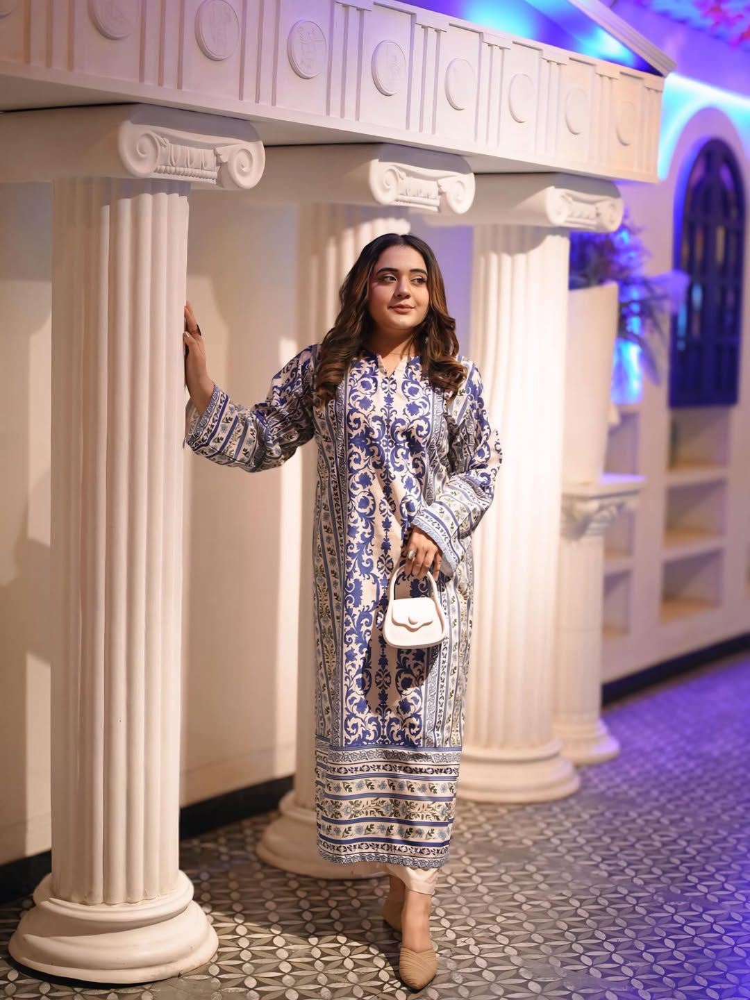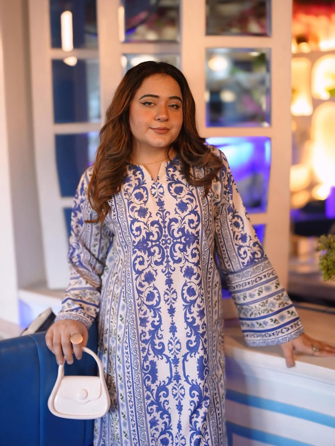 Elevate your everyday elegance with this beautifully printed kaftan, designed in a timeless cream base accented with rich cobalt blue and subtle green motifs.